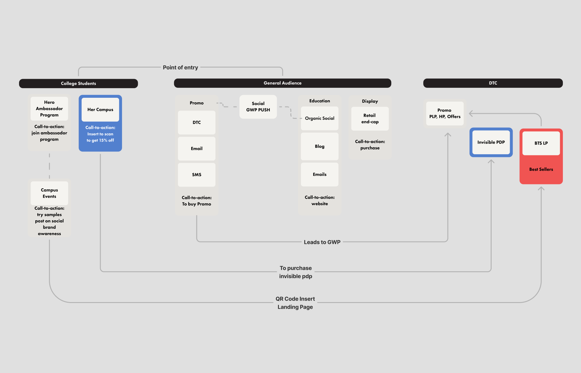 Created a user flow that identified gaps in the campaign journey and refined it to ensure both general and college audiences are directed back to our DTC page.