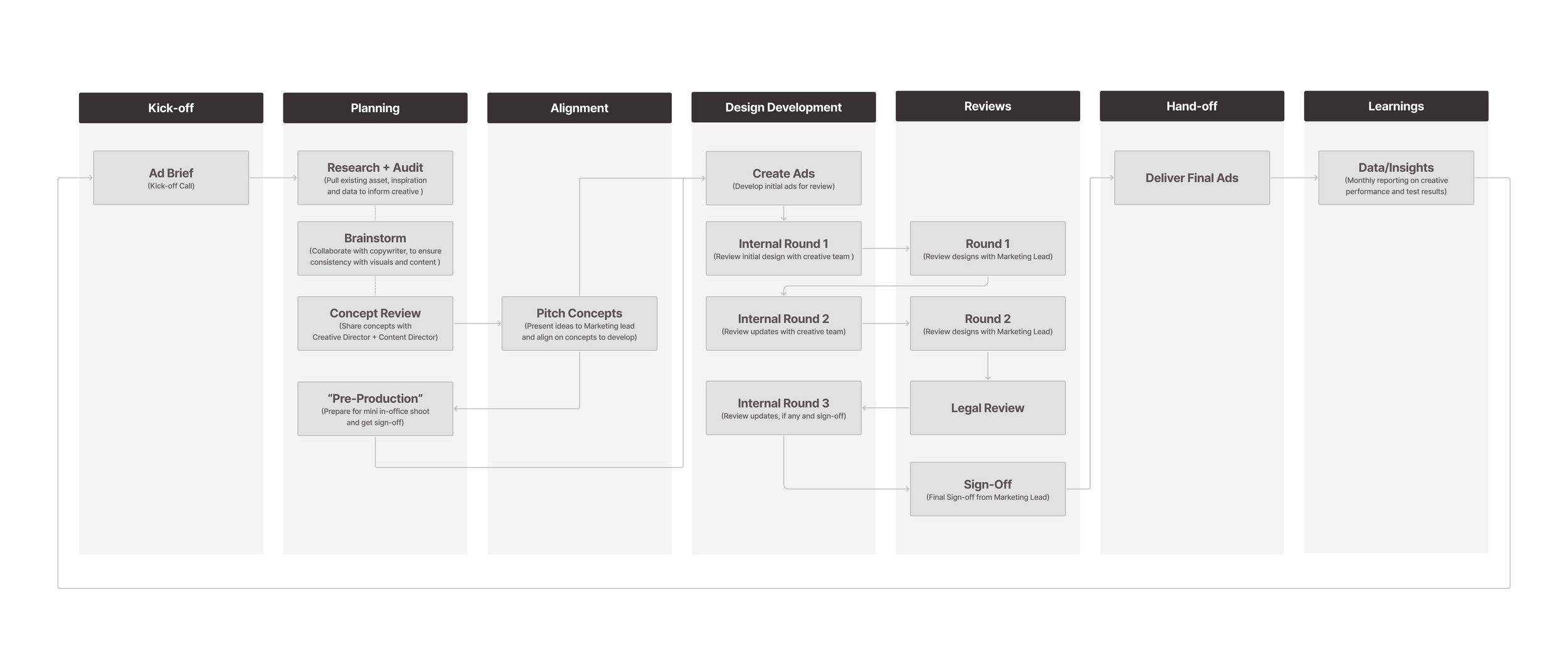 The ads process consists of seven key phases aimed at developing thoughtful ad concepts, with the final step focused on analyzing data for learnings that are applied to future assets.